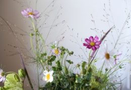 11月になり、急に秋が深まってきました。 10月は、9月の悪天候でお花の流通が極端に少なく、レッスンの仕入れも四苦八苦しましたが、月が替わってやっと秋らしい紅葉の枝ものが出てきました。お花の色もどちらかというとくすんだ色が多くなってきました。 早速、好きな色のお花とブーケを組みました。トルコキキョウ、スプレーバラ、コスモス、薮山査子です。 コスモスの花が風に揺れる様子がとても好きです。