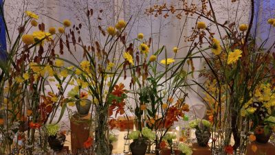 デモンストレーション中のcelineさん。後ろはレッスンに参加された皆様で作製したゲートの作品です。黄色をメインにした色合わせですが、秋色のしっとりとした色合わせです。