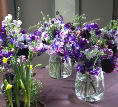 私の好きな色である紫をメインにして4種類のスイートピーを使っています。
