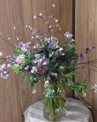 こちらは熊取教室のレッスンで作っていただいたブーケです。長くレッスンを続けてくださっている方の作品です。枝物のミツマタと柔らかな茎の草花のスイートピー、ラナンキュラス、豆の花、ツインキャンドルで束ねてくださいました。難しいと言いつつも風が通り抜けるブーケに仕上げられました。